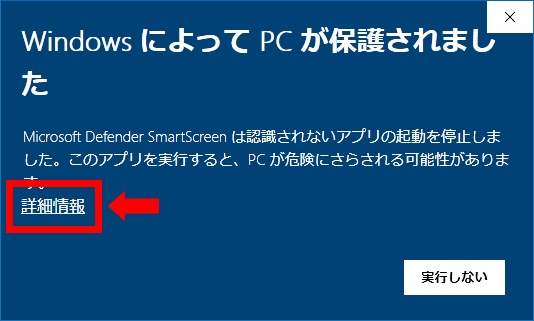 - 「WindowsによってPCが保護されました」と表示されましたら「詳細情報」を押してください。
