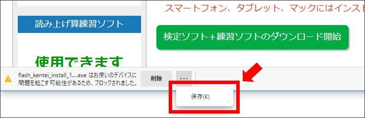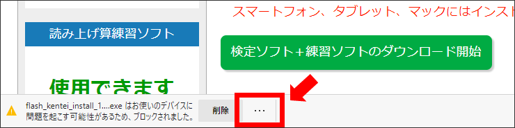 - ダウンロード開始ボタンを押すと、ウィンドウの左下に「お使いのデバイスに問題を起こす可能性があるため、ブロックされました。」等の警告が表示されてダウンロードが止められる場合があります。