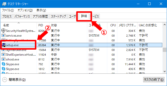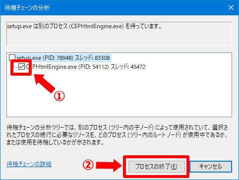 - 「setup.exeは別のプロセス(*****)を待っています。」と表示されていましたら、そのプログラムの左側にあるチェックボックスをチェックして「プロセスの終了」ボタンを押してください。