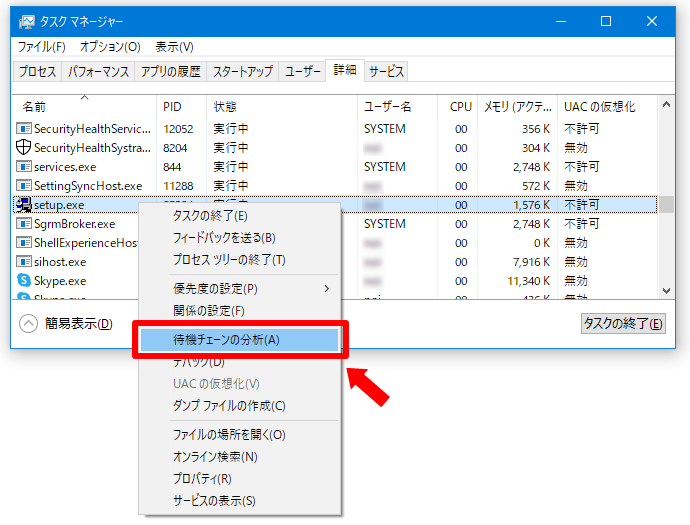 - setup.exe を右クリックして「待機チェーンの分析」を選択してください。