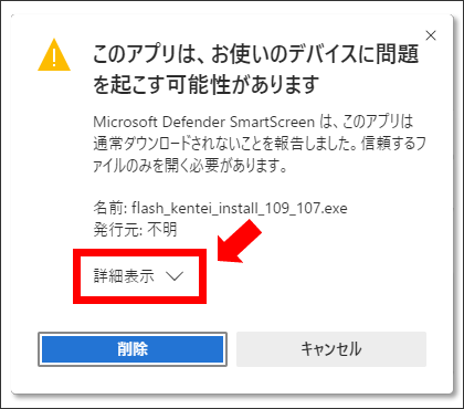 - 「このアプリは、お使いのデバイスに問題を起こす可能性があります」と表示されましたら「詳細表示」を押してください。