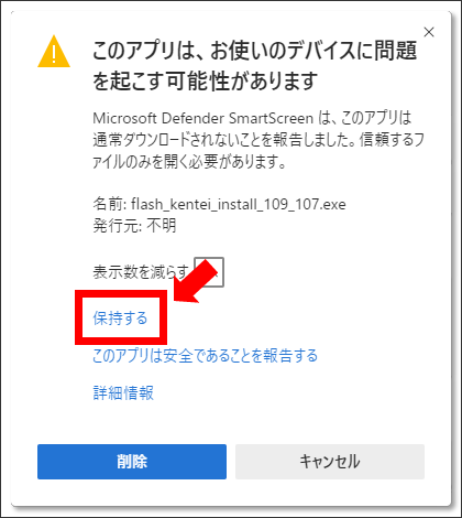 これは、安全なソフトであってもダウンロードされた実績が少ない場合等に表示されるメッセージです。