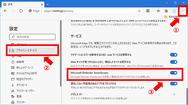 右側にプライバシーとサービスの設定画面が表示されますので、下の方にある「Microsoft Defender SmartScreen」という項目の右側のスイッチを押してオフにしてください。(③)