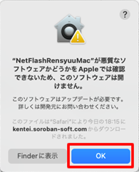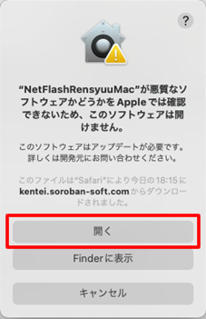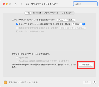 - 「ダウンロードしたアプリケーションの実行許可」の「このまま開く」をクリックしてください。