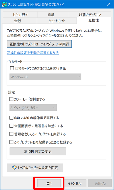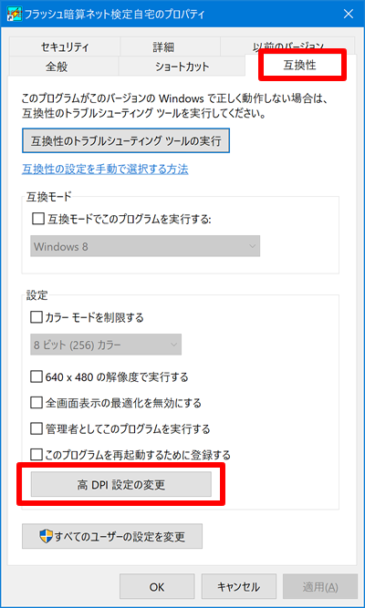 - プロパティウィンドウの互換性にある「高DPI設定の変更」をクリックしてください。