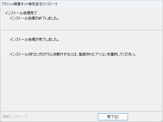 - 以前のインストール時に作成された「フラッシュ暗算ネット検定自宅キット」フォルダが残っていましたら削除してください。