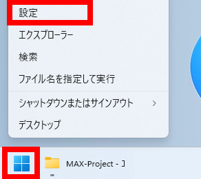 - 画面左下にあるスタートメニューを右クリックして「設定」を選択します。