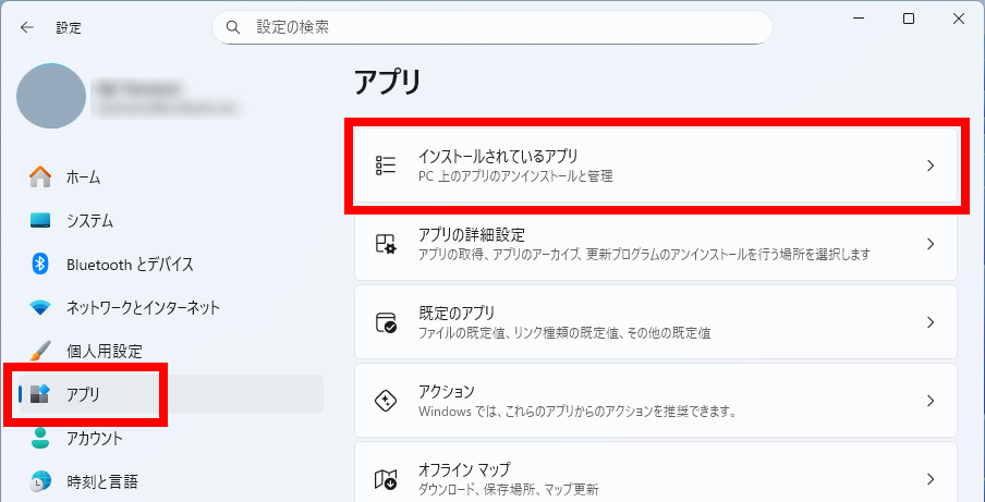 - 「アプリ」をクリックして「インストールされているアプリ」をクリックします。