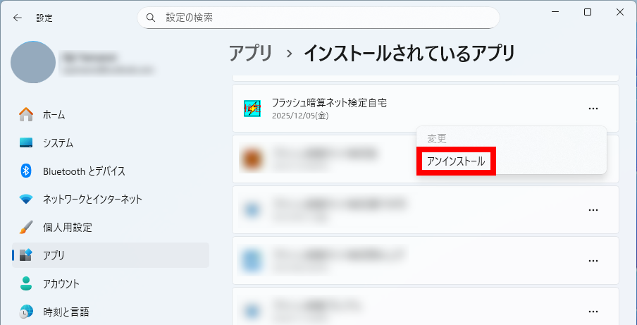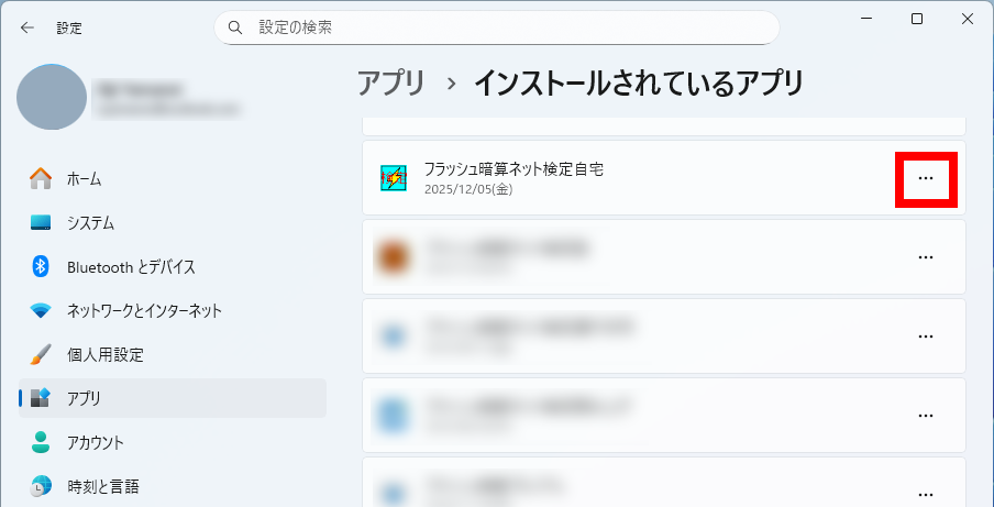 - インストールされているアプリの一覧から「フラッシュ暗算ネット検定自宅」を探して「…」をクリックします。