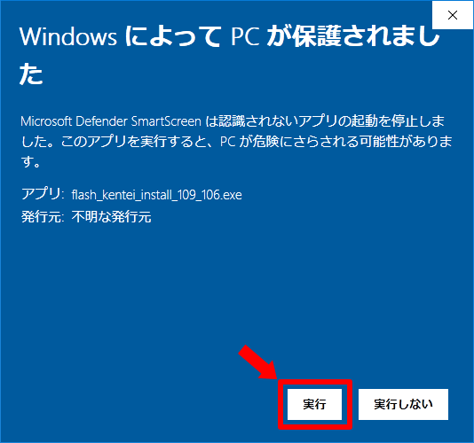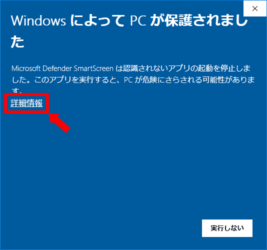 - ファイルの実行時に下記の画面が表示される場合には、「詳細情報」をクリックした後に「実行」をクリックしてください。