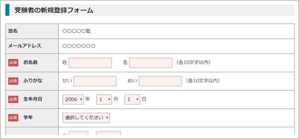 - 「受験者の新規登録」画面で塾ネット番号とメールアドレスを入力して送信ボタンを押してください。
